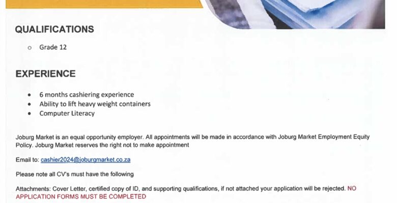 Joburg Market is an equal opportunity employer. All appointments will be made in accordance with Joburg Market Employment Equity Policy. Joburg Market reserves the right not to make appointment