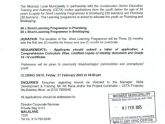 Nkomazi Local Municipality invites unemployed youth to apply for their Short Learning Programmes in Bricklaying and Plumbing (X100 Posts). The Nkomazi Local Municipality in partnership with the Construction Sector &...