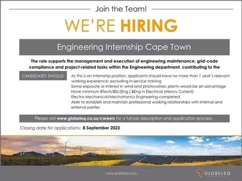 Globeleq: Internship Programme 2024 – The Engineering Intern will assist in the management and execution of engineering maintenance, grid-code compliance and project-related tasks within the Engineering department. Together with the Engineering Department, the Engineering Intern will focus on the development, implementation and maintenance of sound engineering practices through Globeleq’s existing assets, assets under development and assets under construction, with the intention of optimising life-cycle performance. The role may require frequent travel for onsite activities.
